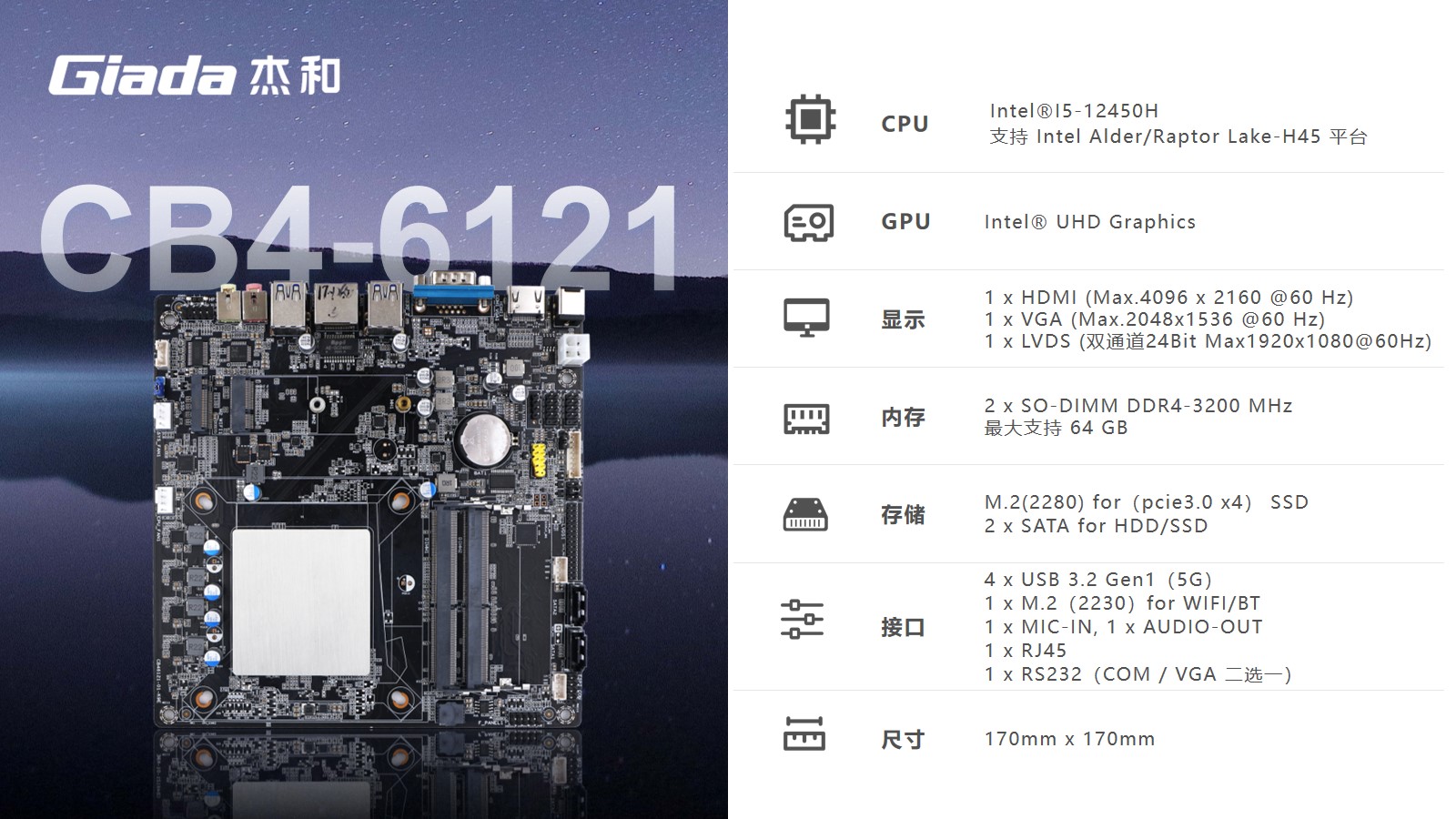 CB4-6121系统采用了170*170mm Thin mini-ITX版型设计,致力于打造更加紧凑和精致的外观,这种规格常用于一体机设计。