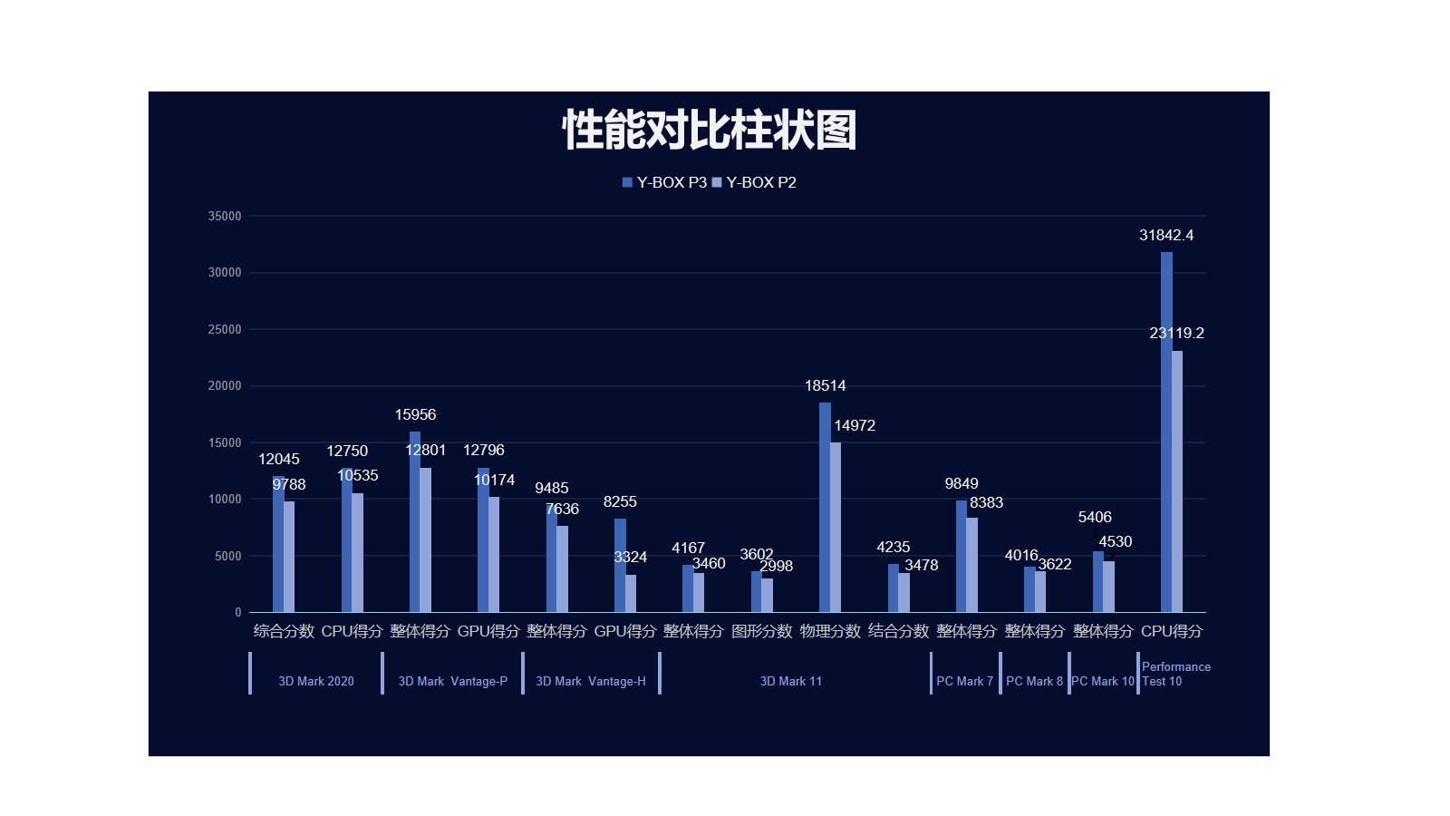 kaiyun来具体看看各个测试项目的跑分情况,kaiyun分别用3D Mark、PC Mark以及Performance 10等不同系列不同软件进行跑分,测试项目涵盖显示性能测试、系统性能测试、CPU性能测试等。通过下面的表格及柱状图可以看出,开云桌面云终端Y-BOX P3的数据在各项性能上都得到了大幅度提升。