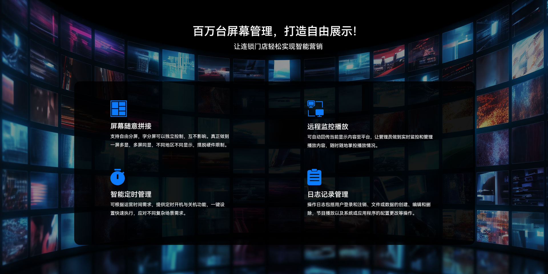 目前开云科技GDSM-ES系统覆盖市场上多形态网络智能显示终端,满足行业全产品业态需求,如广告机、LED显示屏、LCD拼接屏 、普通液晶电视等各种显示终端,广泛用于广告宣传、通知公告、指示引导。