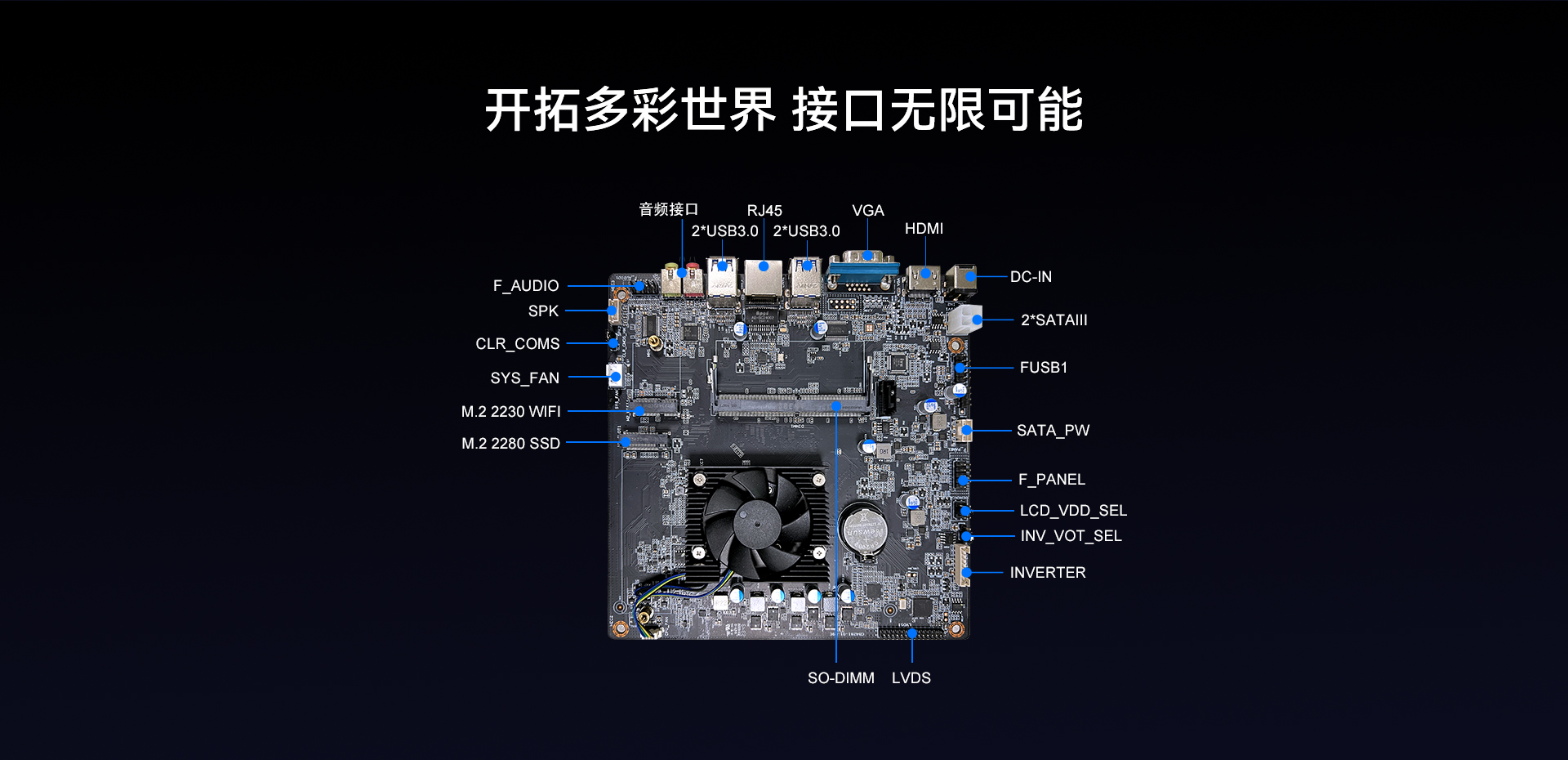 CB4-281有丰富的拓展接口及显示功能,支持1xVGA (Max.2048 x 1536@60Hz),1x HDMI™2.0 (Max.4096x2160@60Hz),1xLVDS(双通道24Bit Max.1920 x 1080@60Hz),外部接口配置4个 USB 3.2 Gen1(5G),内部有2 x USB2.0 9pin,1 x USB2.0 4pin。