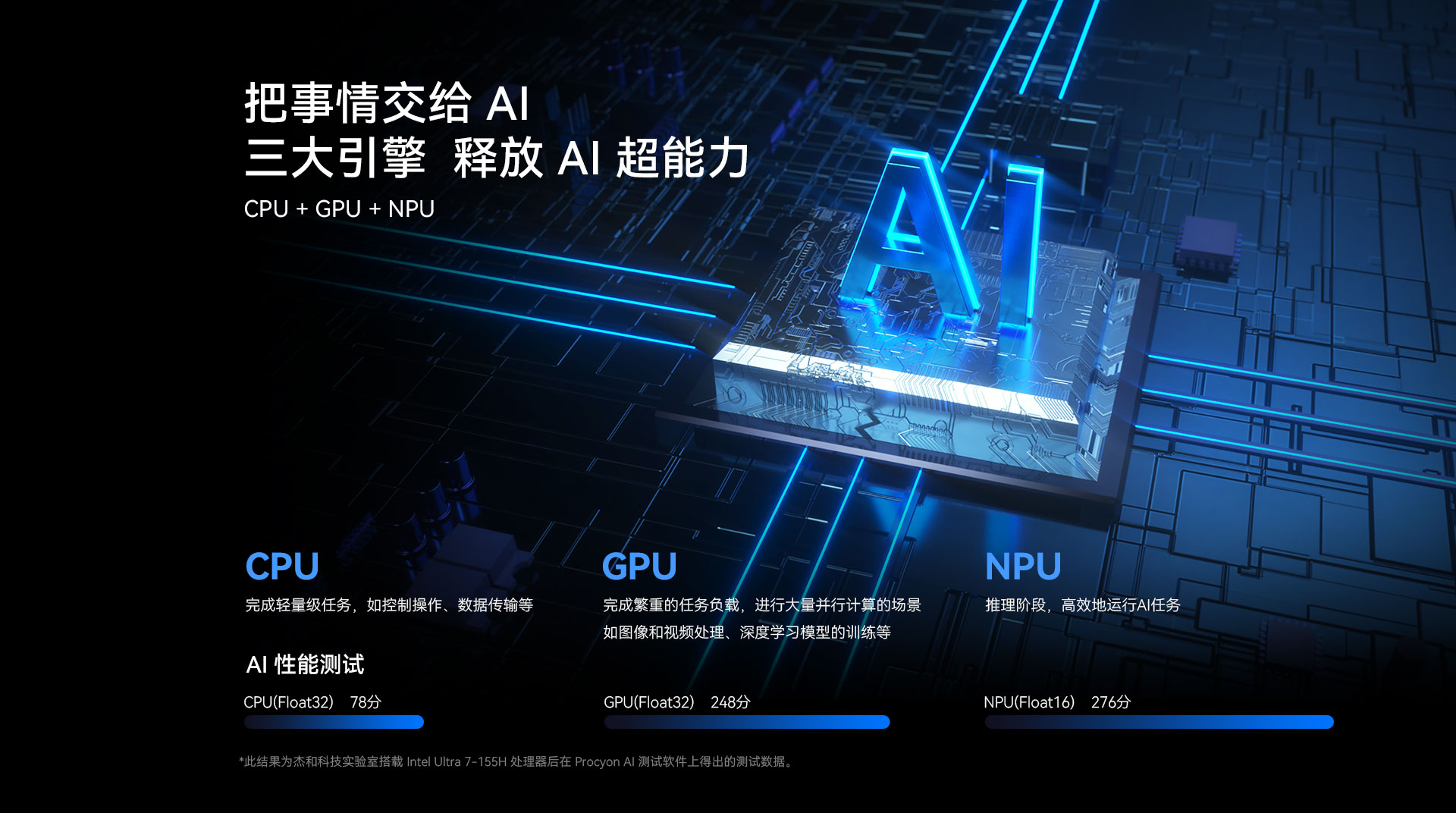 开云科技N601搭载了Intel® Core™ Ultra处理器,可选配Ultra 5- 125H或Ultra 7-155H,全新架构拥有CPU、GPU 和NPU配置。在开云科技实验室里,kaiyun专门用 Procyon AI 这款 AI 性能测试软件对搭载了 Ultra 7-155H 处理器的 N601 进行了测试。最后测试结果显示,N601的CPU分数为78分,GPU 分数为248分,NPU分数为276分,这意味着N601在AI处理方面具有显著优势,能够高效地处理复杂的神经网络计算任务。