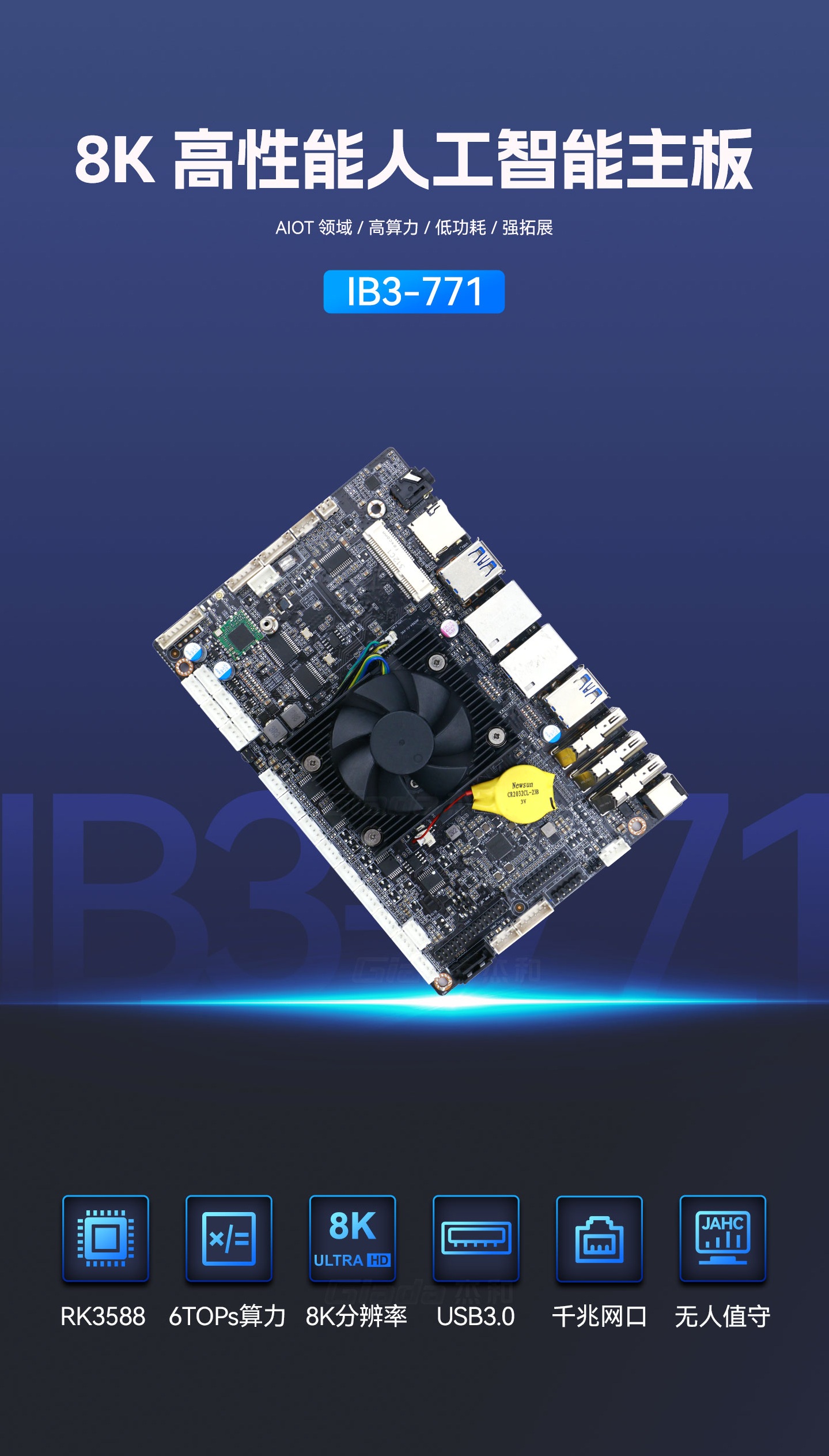 开云科技IB3-771采用瑞芯微全新旗舰级芯片RK3588,搭载八核64位处理器,集成ARM Mali-G610 MP4 GPU,高算力、低功耗、具备强大的视觉处理能力;性能强悍的RK3588内置AI加速NPU,提供6TOPs算力,支持主流深度学习框架,为各类AIoT应用场景提供更优的性能表现。