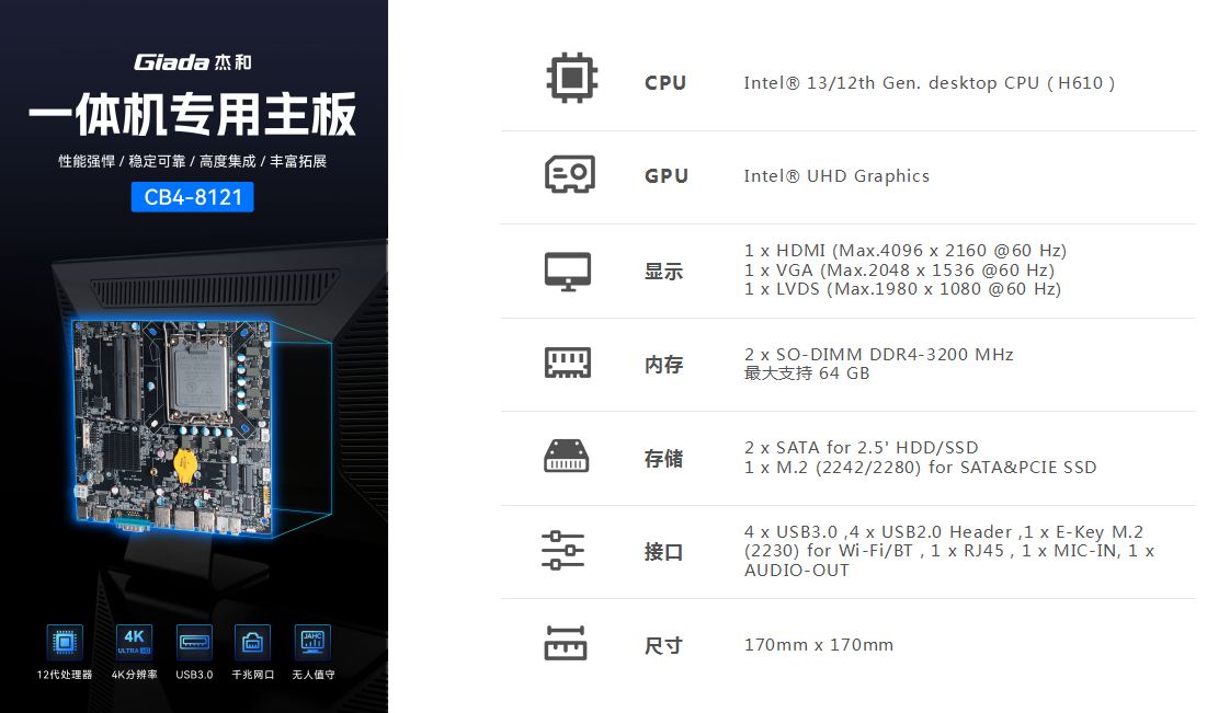CB4-8121配备4个USB3.0接口(速度5 Gbps),支持扩展键盘、鼠标、打印机、U盘等设备,可以满足多样化的日常拓展需求的同时,实现高速数据传输;提供DMI、VGA和LVDS接口,最高支持4K@60Hz超清显示输出,配备1 x MIC-IN, 1 x AUDIO-OUT音频接口,满足用户对高质量音视觉效果的需求;支持Sata、M.2 NVME存储接口,板内提供了丰富的插针,供客户进行选择性的接口与功能拓展;网络配置方面,支持千兆自适应RJ45网口,让用户能够体验到更加迅捷和稳定的网络连接。