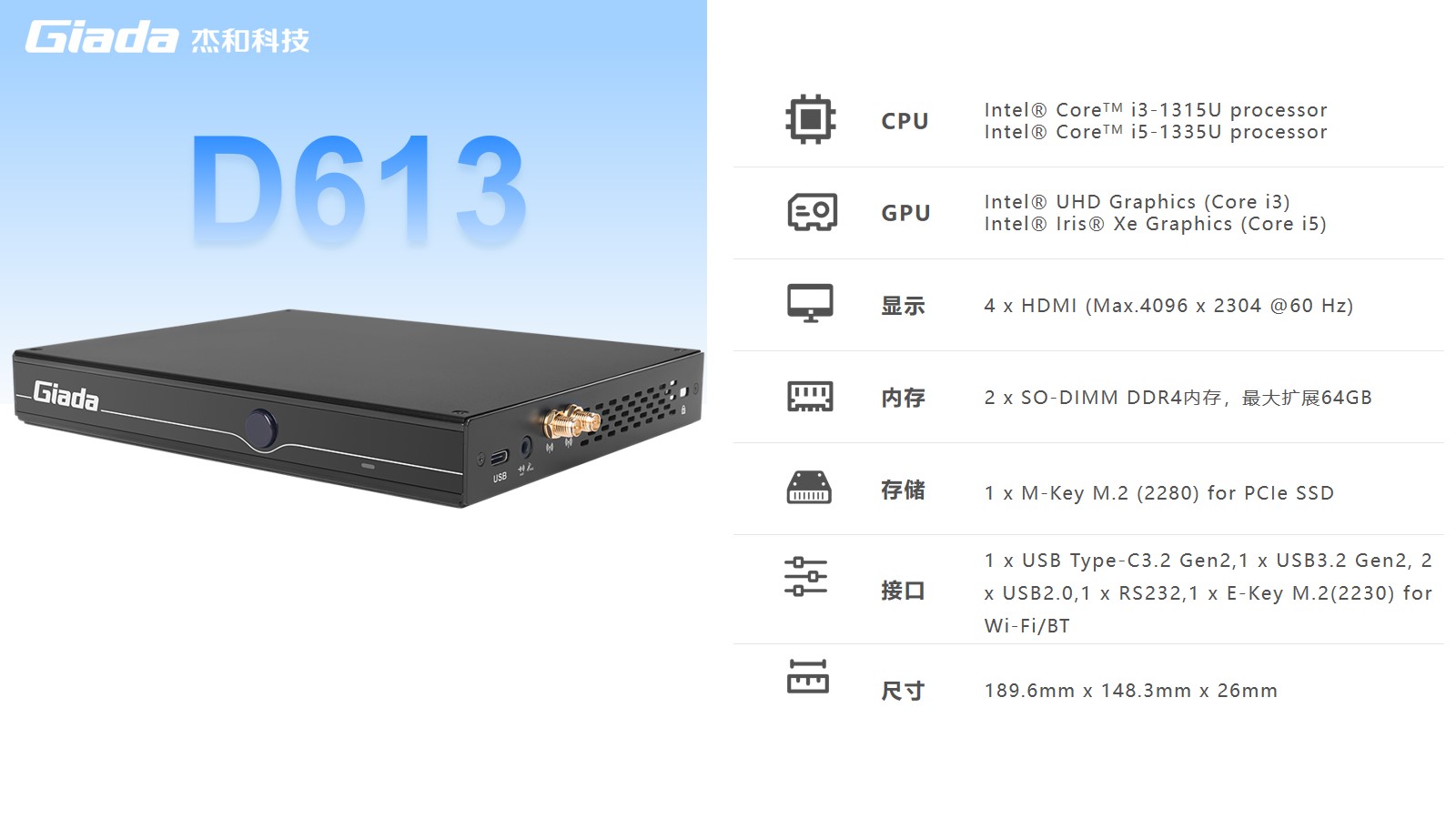 开云数字标牌D613搭载Intel RaptorLake Corei3-1315U/i5-1335U处理器,可以同时连接4个4K显示器,支持4K分辨率编码解码,还支持5G蜂窝网络,速度比4G LTE快10倍。