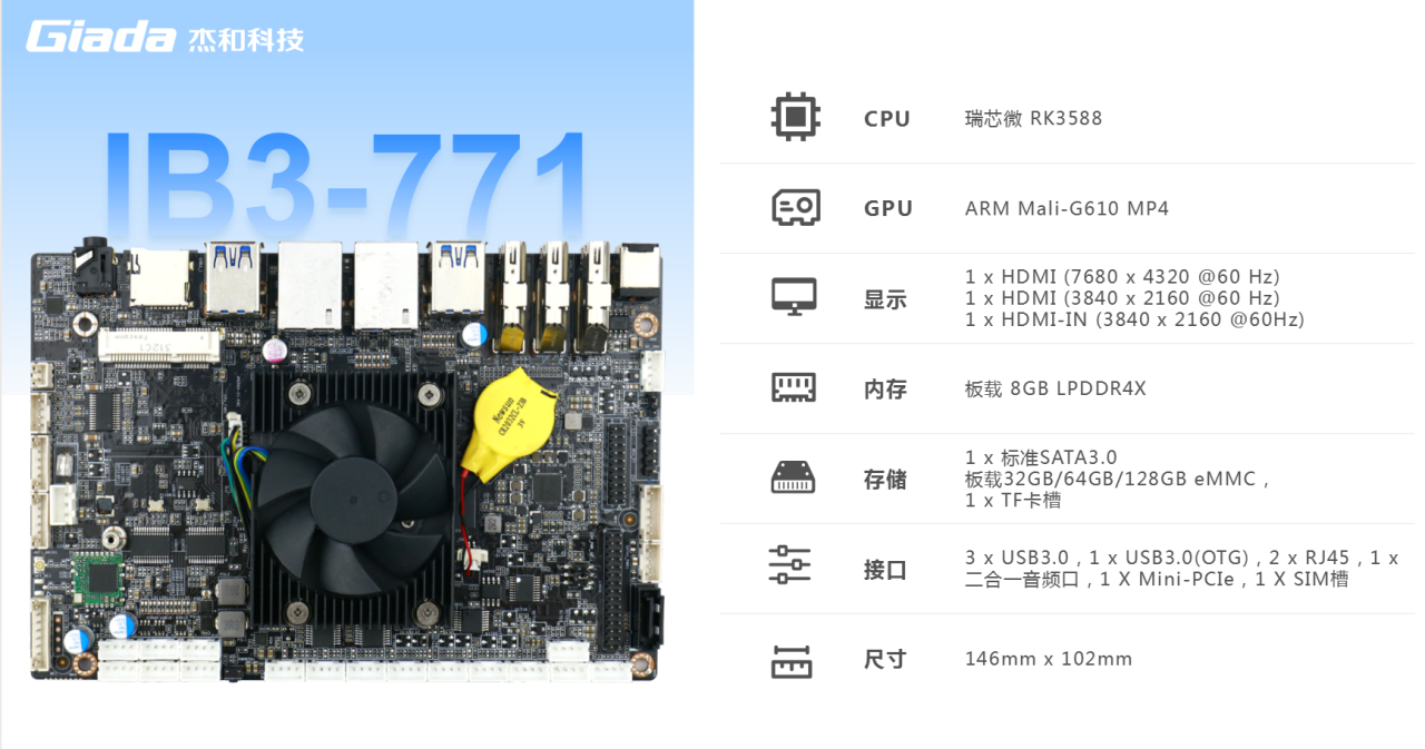 开云系统IB3-771搭载瑞芯微RK3588八核64位处理器,内置6TOPS算力的NPU,具备高算力、内存大、超强多媒体、多重扩展等技术优势。满足8k超高清视频的显示需求,还支持主流深度学习框架,为各类 AIOT 应用场景提供更优的性能表现,支持机器人、边缘计算、智能NVR、智能汽车、智慧大屏、AR/VR、智能自助终端场景的广泛应用。