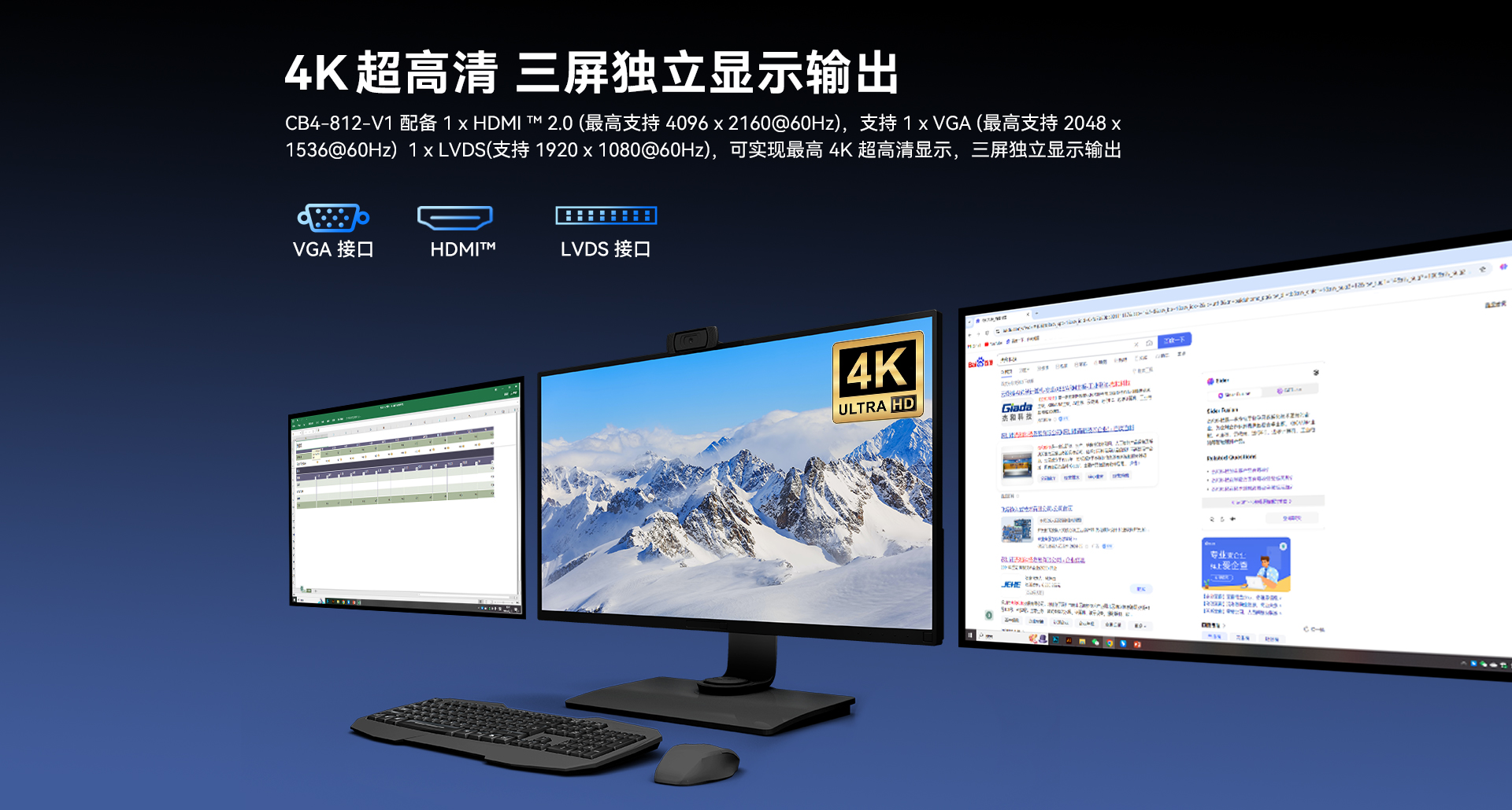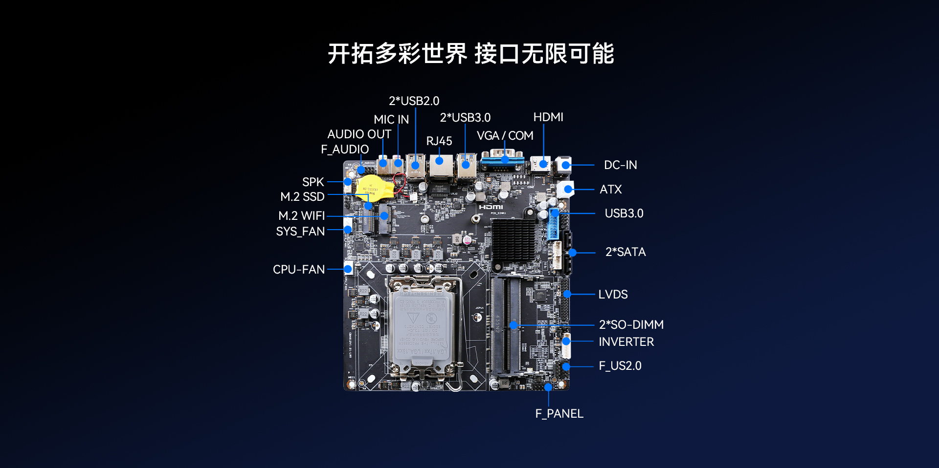 | 外部I/O | 接口 | 2 x USB 3.2 Gen1(5G) 1x VGA (Max.2048 x 1536@60Hz) 1x HDMI 2.0 (Max.4096x2160@60Hz) 1x LVDS( 双通道 24Bit Max.1920*1080@60Hz) 1 xDP (Max.4096 x 2160@60Hz) 1 x MIC-IN, 1 x AUDIO-OUT 1 x RJ45 1 x RS232(COM / VGA 二选一) |