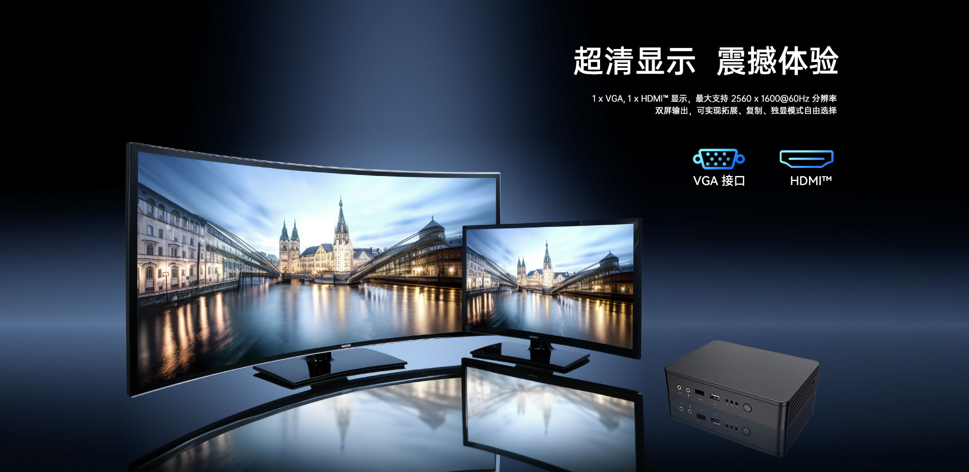 1 x HDMI,1xVGA双视频接口输出